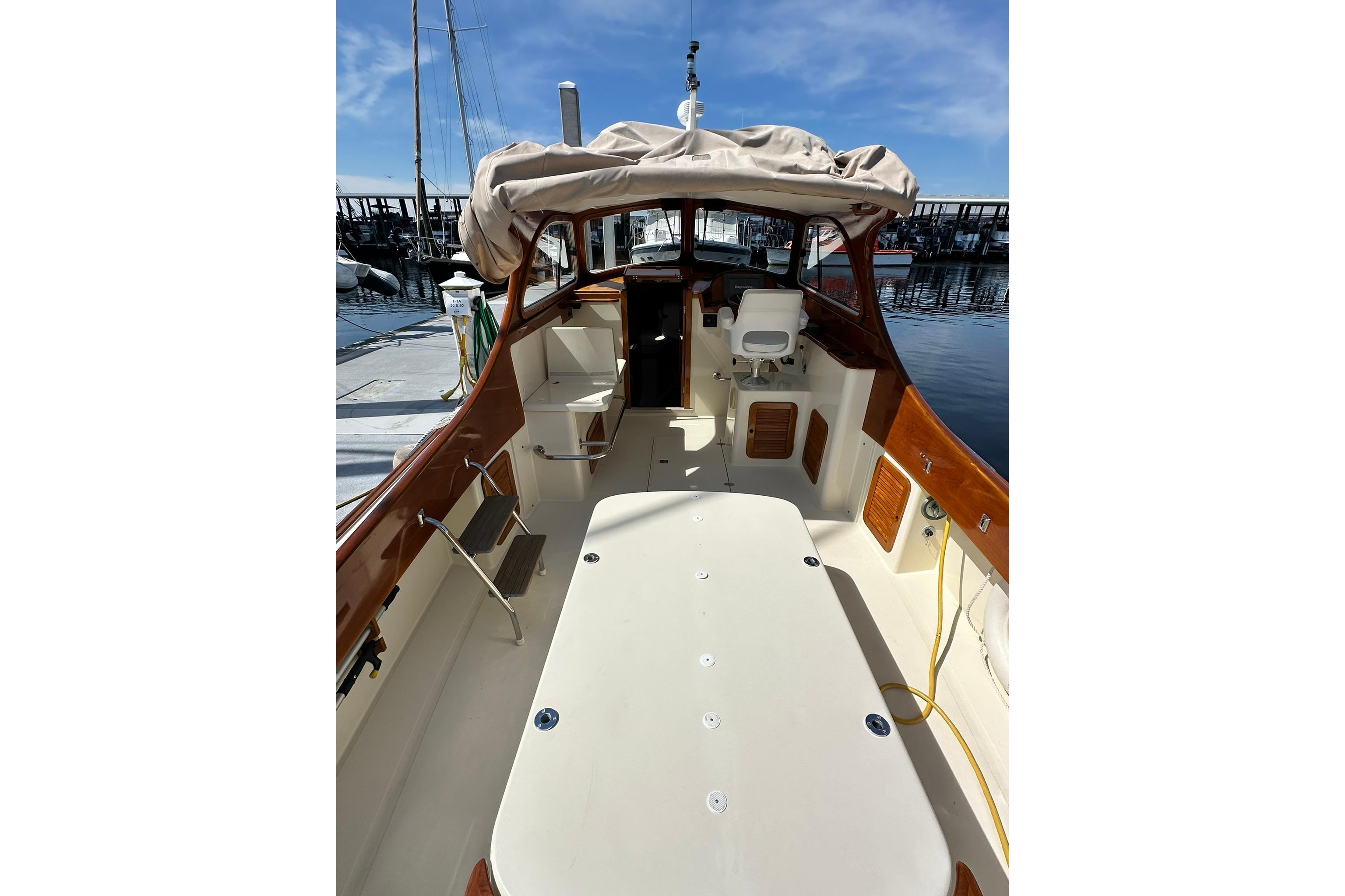 • Interior:The interior is finished in satin varnished cherry and includes a teak and holly cabin sole.The boat comfortably sleeps two below and offers ample space in the pilothouse/cockpit for guests.